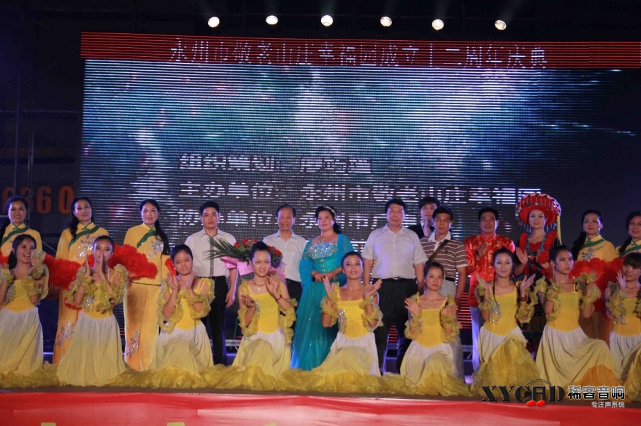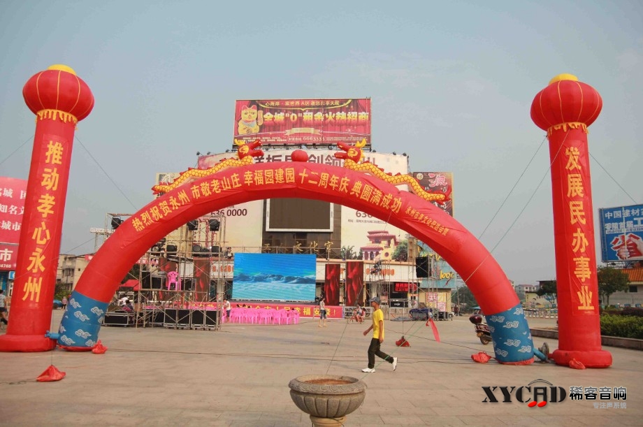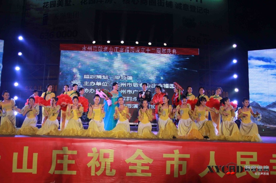 永州市敬老山庄幸福园成立12周年晚会于2012年8月26日晚在永州市工人文化宫广场举行。永州“孝”文化协会,省市各级领导,以及社会各界人士出席了晚会。晚会活动现场气氛热烈,弘扬了以“孝"为中心的尊老敬老养老的中华民族传统美德。本次晚会采用我公司生产的大型室外线阵LA-3212以及经典的LASUB218担当重任。