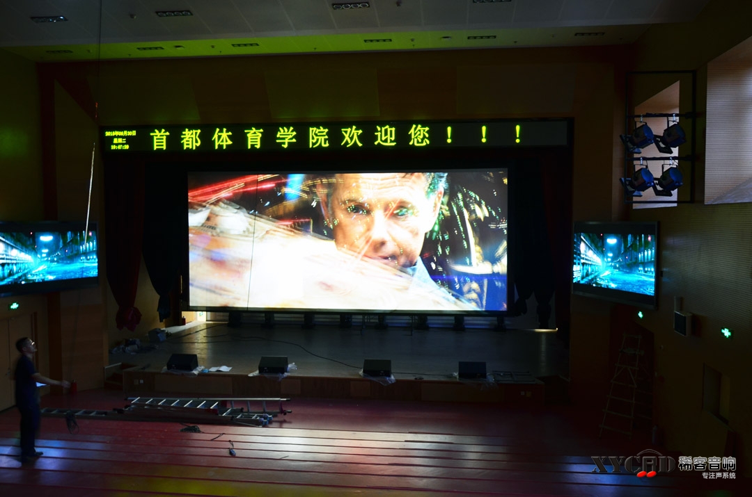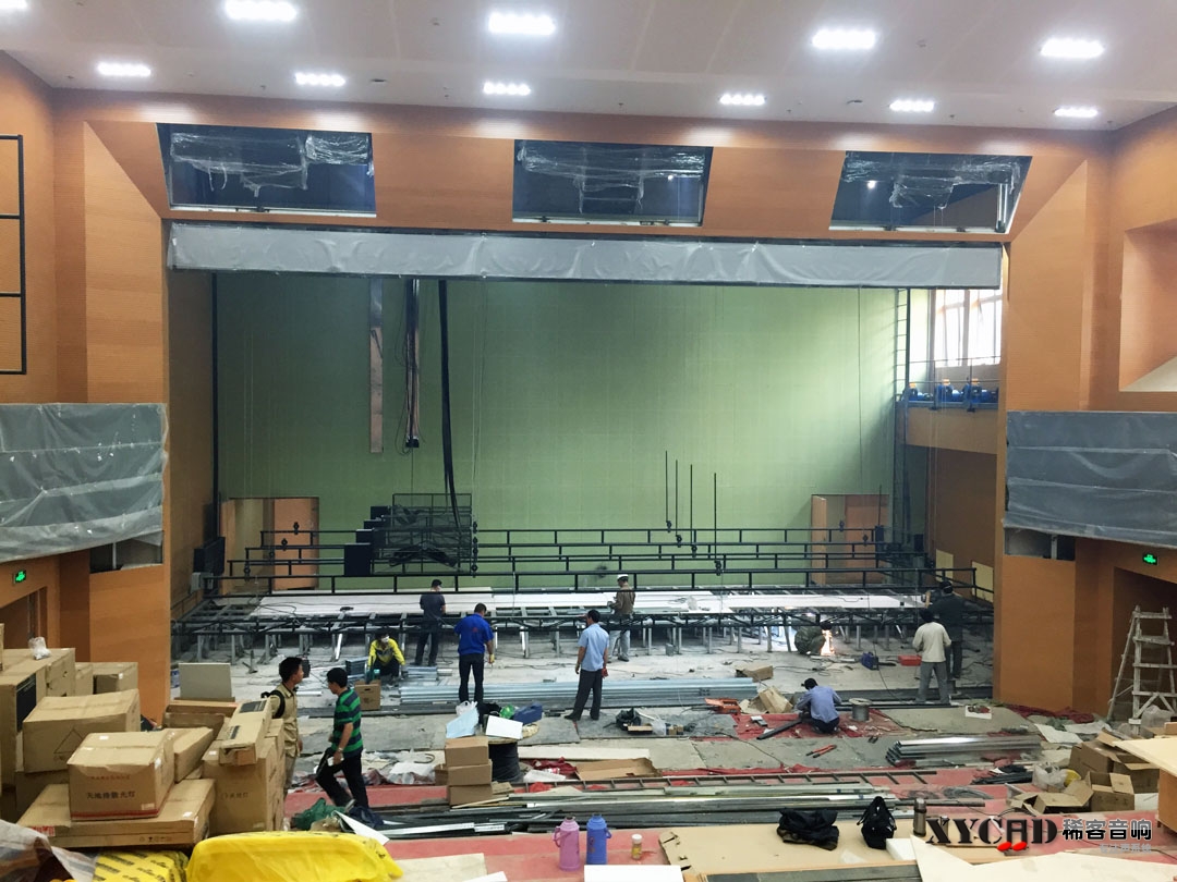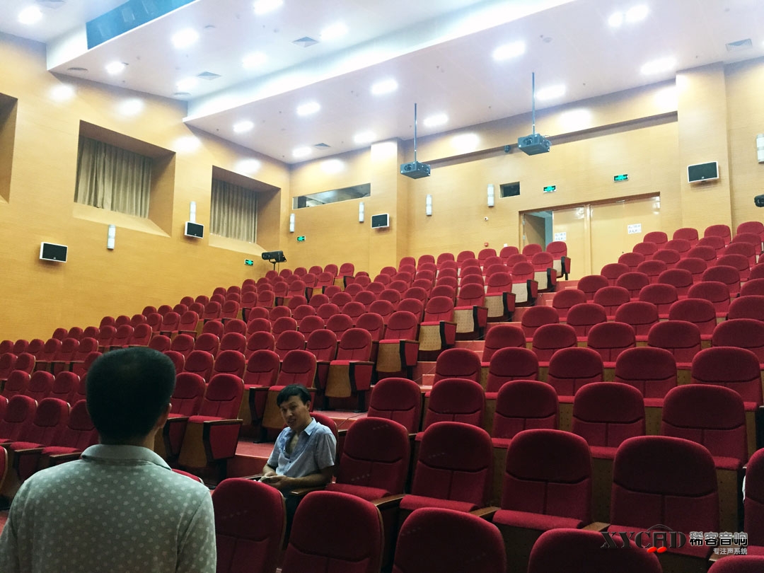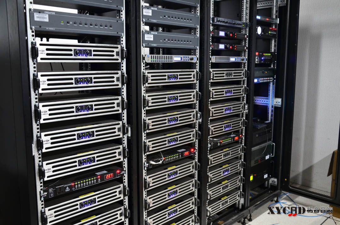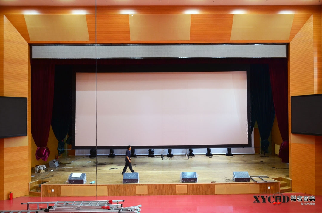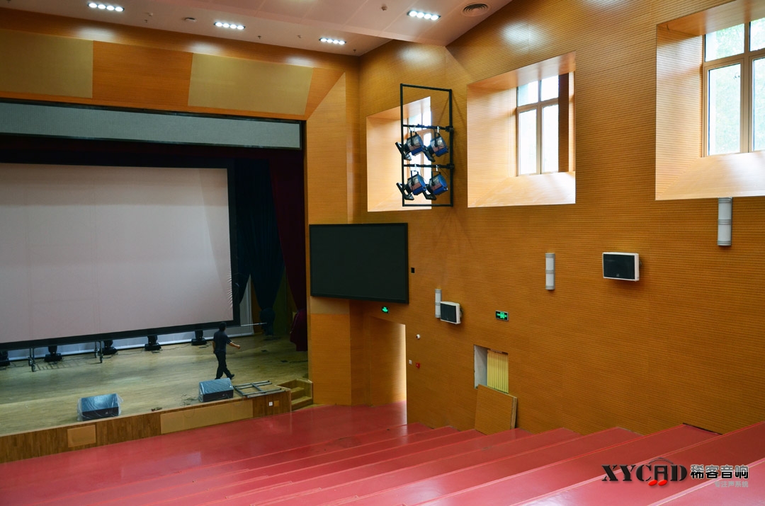 主扩音箱采用xycad 稀客X-Array2103F 双10吋外置两分频线性阵列扬声器分布在声桥左中右隐藏式安装。