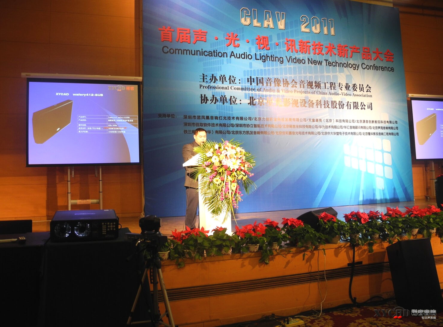 2011年12月3日首届“2011声•光•视•讯新技术新产品大会”在北京星光影视园梅地亚大酒店拉开帷幕,此次大会由中国音像协会音视频工程专业委员会主办。大会邀请了行业众多专家、知名生产厂商、国内外品牌代理商、工程商、行业协会、机关团体、媒体、部队等470余名代表参会。我公司携荣获国家多项专利的超薄低音产品也应邀参加了此次盛会并作关于超薄系统的设计报告,获得学术界热烈反响。
