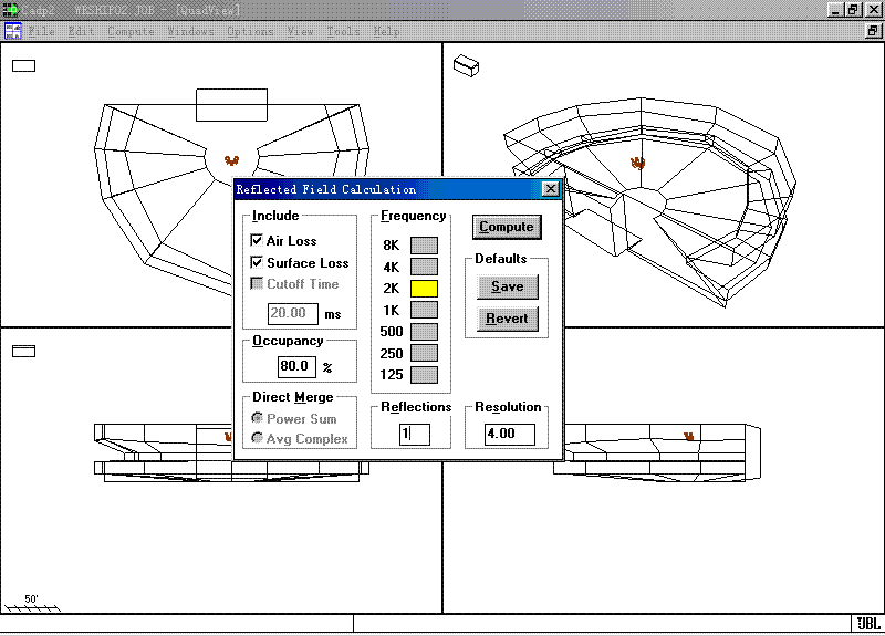 大家可以看到此窗口与直达场计算窗口一样,只是先前的Reflected选项在此处被激活,这里必须输入计算的反射场的反射次数。我们说过反射场的计算要比直达场复杂得多,一般不超过三次。否则其计算所需时间会非常之长且会让人难以忍受。具体视环境的复杂程度及计算机配置高低。通常一次反射场需十几至几十秒。二次反射场需几分种或十几分钟不等。一般来说,超过二次以上的反射场计算并无必要。因为其反射声压已相对很弱,所以这里我们只输入1。单击Compute开始计算。
